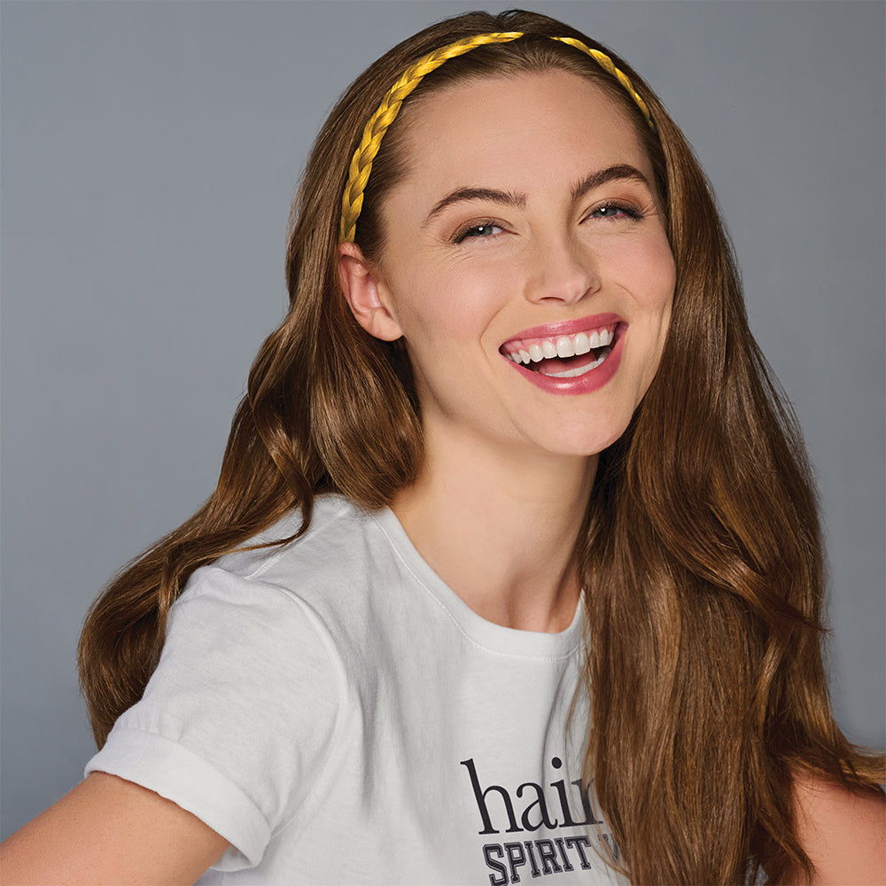 Soften the braid by massaging it and loosening it up. You can style this in so many ways and you can also remove the adjustable strap and slide in bobby pins to place into updos or for a strapless application. Use this headband with your hair up or down. Adding some braids to your own hair can add to this look. Do not use heat on this braid.