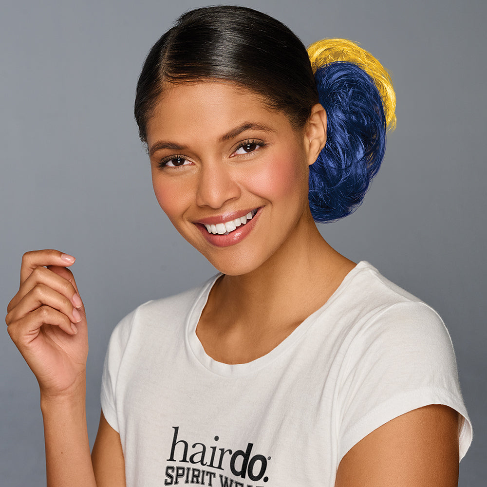 For a more secure application, secure your hair into a pony or bun using an elastic hair tie. Shake out the wrap and brush the hair to enhance the look. Wrap around once or twice and finger style by pulling the ends of the hair into position. Place one on and then add the other color or combine them and twist them together so the colors intertwine before applying. You can add bobby pins to secure the wraps if your hair is thin or too short to put into a bun or pony. Add dry shampoo to the fiber if it feels shiny. Do not use heat to style these wraps.