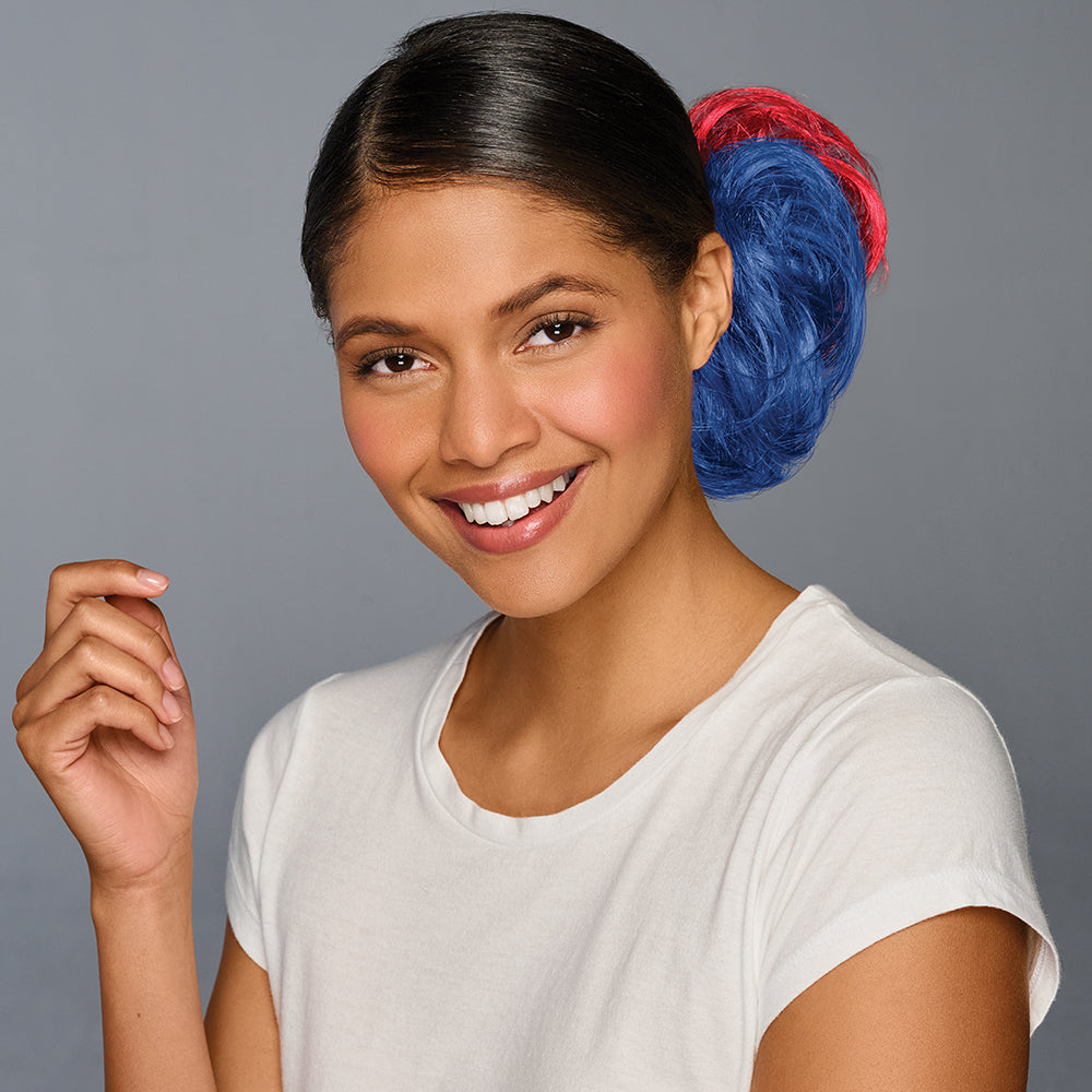 For a more secure application, secure your hair into a pony or bun using an elastic hair tie. Shake out the wrap and brush the hair to enhance the look. Wrap around once or twice and finger style by pulling the ends of the hair into position. Place one on and then add the other color or combine them and twist them together so the colors intertwine before applying. You can add bobby pins to secure the wraps if your hair is thin or too short to put into a bun or pony. Add dry shampoo to the fiber if it feels shiny. Do not use heat to style these wraps.