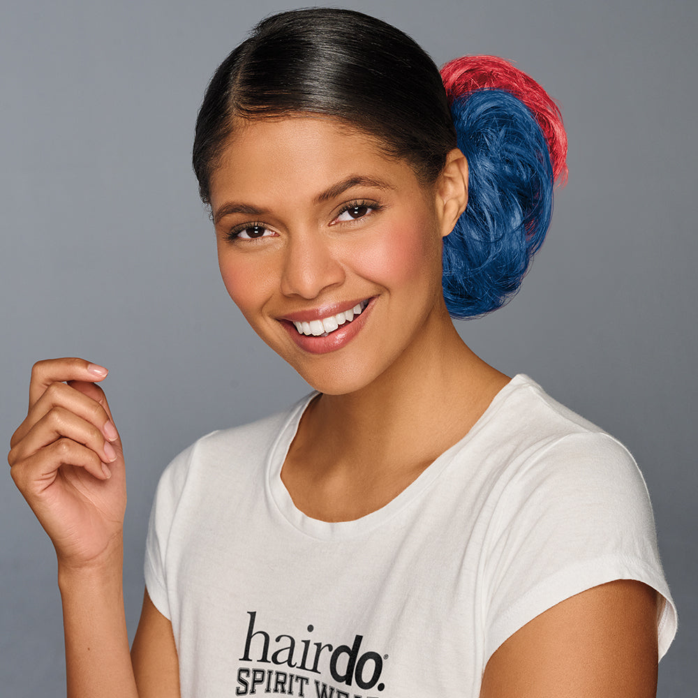 For a more secure application, secure your hair into a pony or bun using an elastic hair tie. Shake out the wrap and brush the hair to enhance the look. Wrap around once or twice and finger style by pulling the ends of the hair into position. Place one on and then add the other color or combine them and twist them together so the colors intertwine before applying. You can add bobby pins to secure the wraps if your hair is thin or too short to put into a bun or pony. Add dry shampoo to the fiber if it feels shiny. Do not use heat to style these wraps.