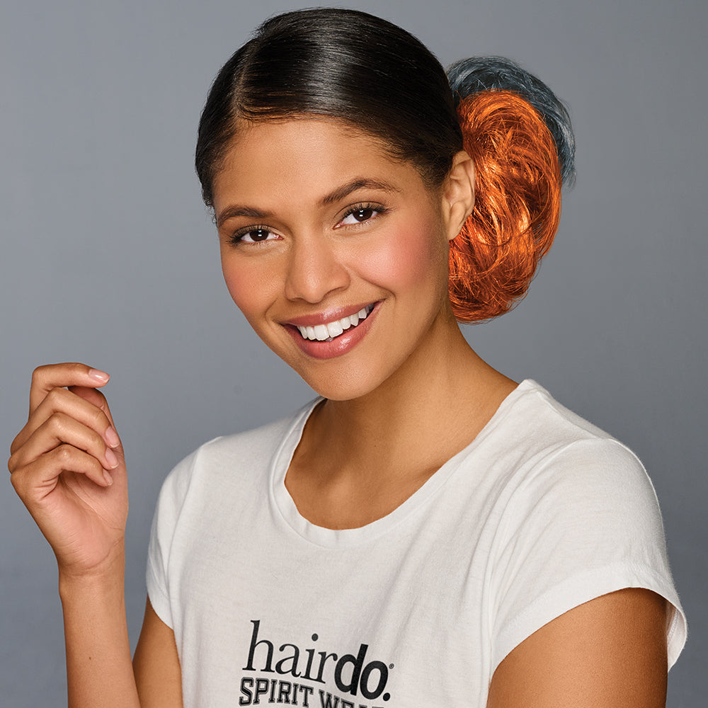 For a more secure application, secure your hair into a pony or bun using an elastic hair tie. Shake out the wrap and brush the hair to enhance the look. Wrap around once or twice and finger style by pulling the ends of the hair into position. Place one on and then add the other color or combine them and twist them together so the colors intertwine before applying. You can add bobby pins to secure the wraps if your hair is thin or too short to put into a bun or pony. Add dry shampoo to the fiber if it feels shiny. Do not use heat to style these wraps.