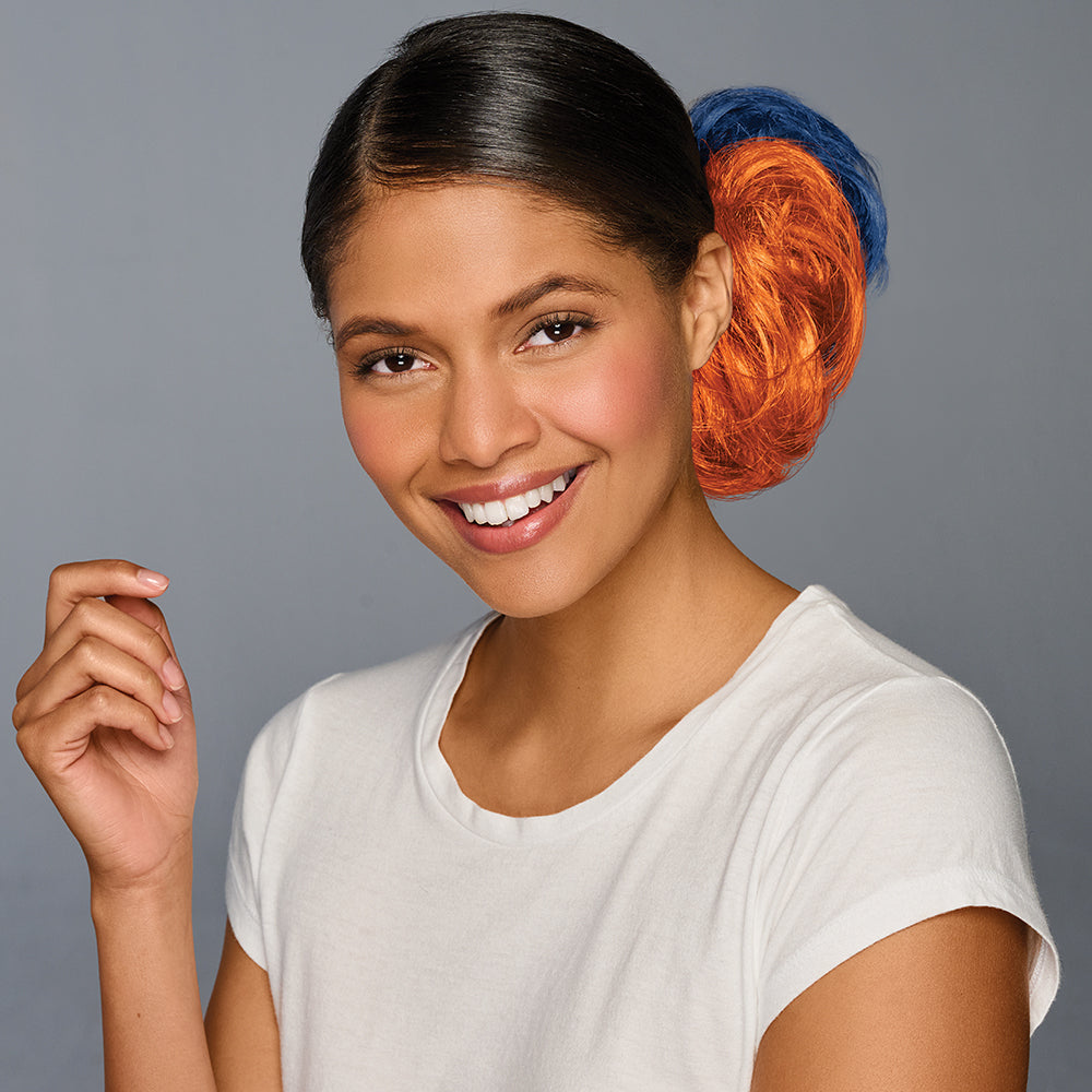 For a more secure application, secure your hair into a pony or bun using an elastic hair tie. Shake out the wrap and brush the hair to enhance the look. Wrap around once or twice and finger style by pulling the ends of the hair into position. Place one on and then add the other color or combine them and twist them together so the colors intertwine before applying. You can add bobby pins to secure the wraps if your hair is thin or too short to put into a bun or pony. Add dry shampoo to the fiber if it feels shiny. Do not use heat to style these wraps.