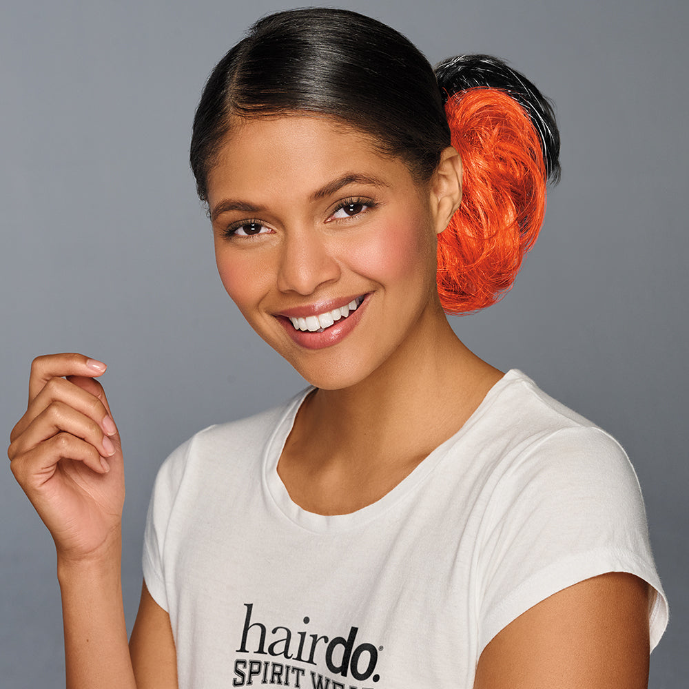 For a more secure application, secure your hair into a pony or bun using an elastic hair tie. Shake out the wrap and brush the hair to enhance the look. Wrap around once or twice and finger style by pulling the ends of the hair into position. Place one on and then add the other color or combine them and twist them together so the colors intertwine before applying. You can add bobby pins to secure the wraps if your hair is thin or too short to put into a bun or pony. Add dry shampoo to the fiber if it feels shiny. Do not use heat to style these wraps.